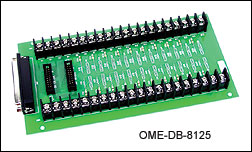 OME-DB-8125 Screw Terminal Board The OME-DB-8125 screw terminal board(Dimensions: 221 mm x 115mm) has two 20-pincable connectors and one 37-pin D-sub connector.Two 2 m (6.6') OME-CA-2020 20-pin flat cables areincluded with the board. The OME-DB-8125screw terminal board acts as an analog I/Oscrew terminal panel to connect to OME-A-812PGor OME-PIO-D64, but can be used for digital I/Owith any other OME series boards that have two20-pin flat connectors for digital I/O.